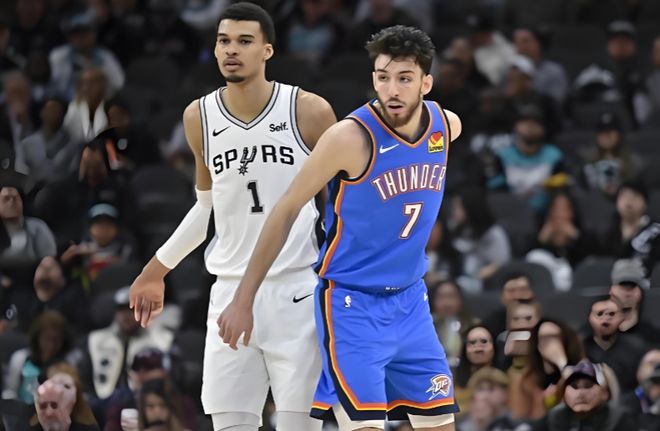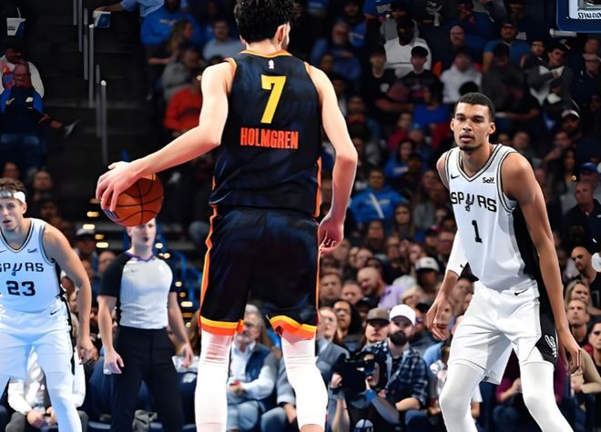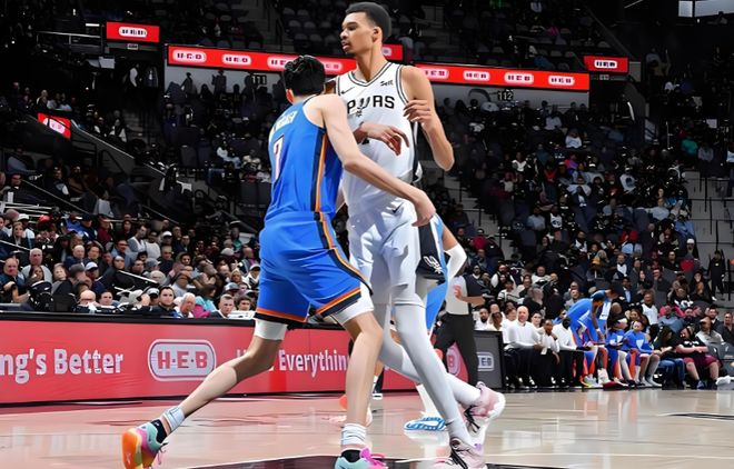 以馬刺這場比賽為例,當(dāng)文班開始在肘區(qū)持球面框進攻時,雷霆的防守明顯開始出現(xiàn)猶豫,切特如果選擇單防,文班可以依靠身高臂展得分,而一旦選擇協(xié)防,雷霆外圍密不透風(fēng)的輪轉(zhuǎn)必然會被拉長。