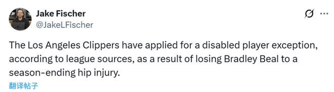 北京時(shí)間11月22日,據(jù)名記杰克-費(fèi)舍爾報(bào)道,鑒于布拉德利-比爾因髖部傷勢(shì)賽季報(bào)銷,洛杉磯快船隊(duì)已經(jīng)申請(qǐng)傷病特例。