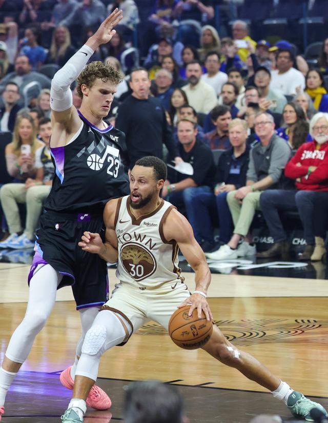 新華社照片,舊金山(美國),2025年11月25日 11月24日,勇士隊球員庫里(右)在比賽中帶球突破。 當(dāng)日,在2025-2026賽季NBA常規(guī)賽中,金州勇士隊主場134比117戰(zhàn)勝猶他爵士隊。 新華社發(fā)(董旭東攝)