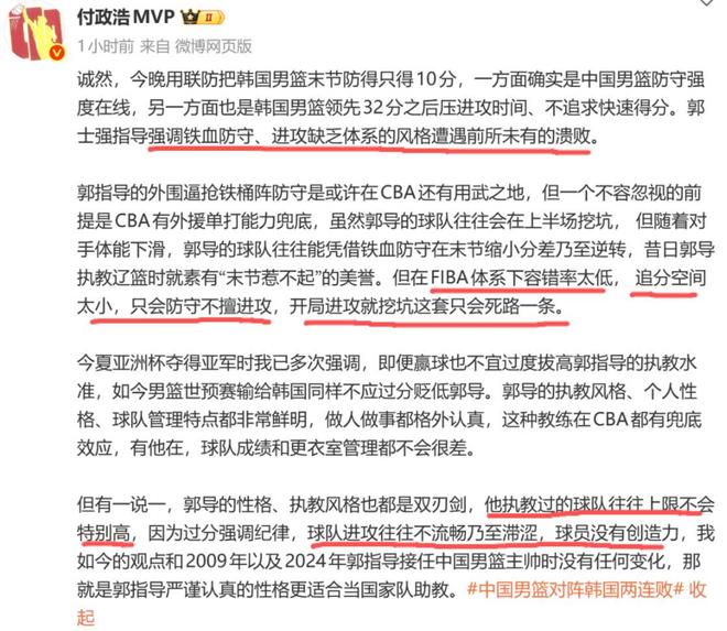 另外,媒體人付政浩也同樣發(fā)文點評了這場比賽,他一針見血指出郭士強強調(diào)的防守和進攻缺乏體系的風(fēng)格,就是造成中國男籃在世預(yù)賽吞下兩連敗的原因。付政浩表示,郭士強的外圍鐵桶陣防守或許在CBA還有用武之地,但前提是CBA有外援單打能力兜底,但在FIBA體系下,中國隊追分空間太小,只會防守不擅進攻,開局進攻就挖坑只會是死路一條。