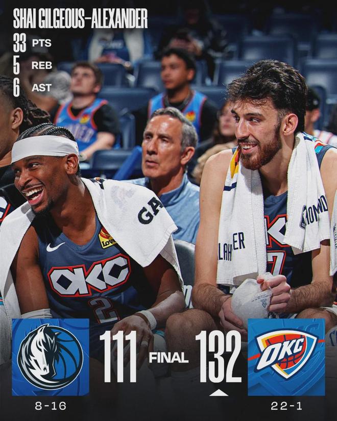 此役過后,雷霆22勝1負(fù)繼續(xù)排名聯(lián)盟第一,活塞18勝5負(fù)排名聯(lián)盟第二。雷霆領(lǐng)先活塞4個勝場,領(lǐng)先西部第二的火箭5.5個勝場。亞歷山大出戰(zhàn)28分33秒,投籃12中10,三分2中2,罰球12中11,狂砍33分5板6助,正負(fù)值+24!
