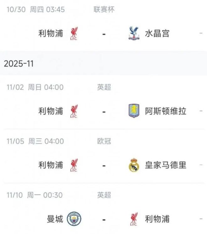要知道四連敗可是利物浦多年來沒遭遇到過的情況了,接下來,他們會(huì)遇到水晶宮的挑戰(zhàn)。這可是斯洛特苦主,對此,這個(gè)主帥可是太熟悉了。打完水晶宮后(聯(lián)賽杯),隨后兩輪英超他們會(huì)遇到維拉和曼城的挑戰(zhàn)。阿斯頓維拉在撤下了埃利奧特后,打出五連勝態(tài)勢發(fā)揮不俗;曼城也是慢慢回到正軌的。