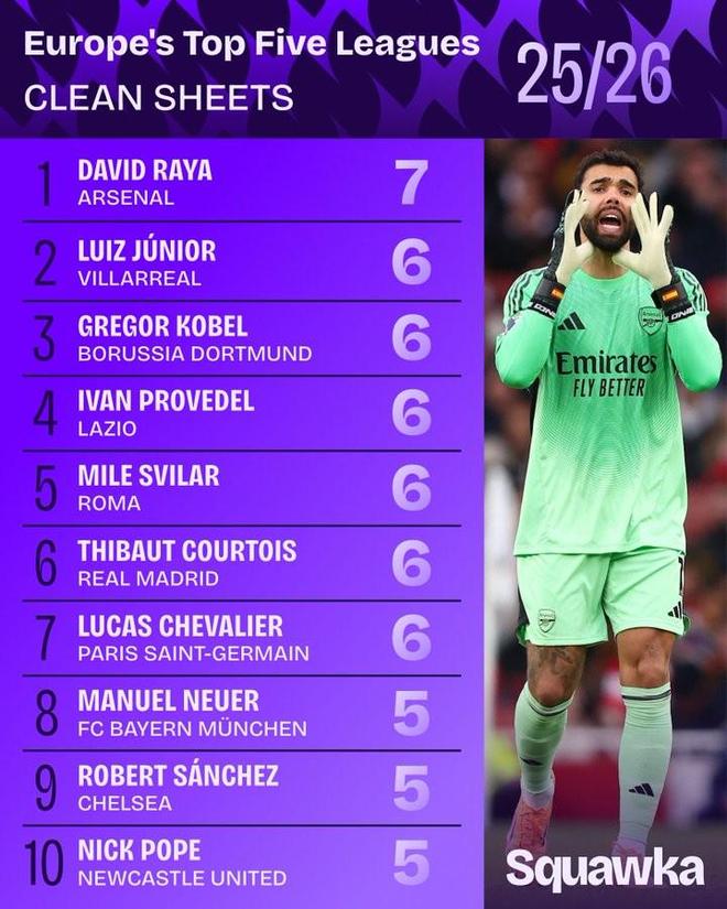 數(shù)據(jù)統(tǒng)計(jì)機(jī)構(gòu)Squawka統(tǒng)計(jì)出本賽季截至目前五大聯(lián)賽門將零封榜,戴維-拉亞7次零封居首。